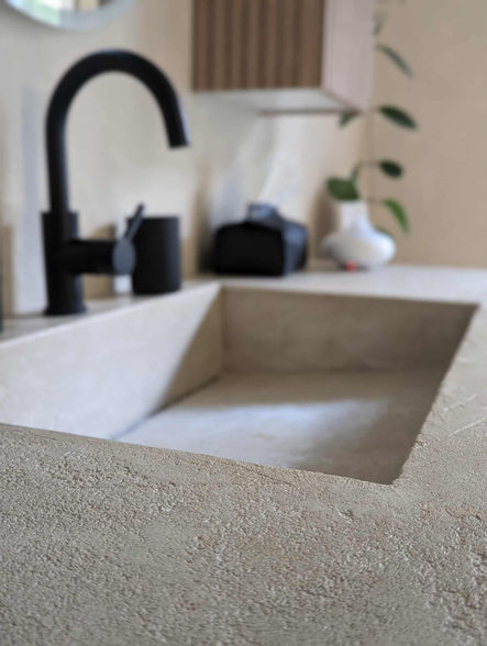 Cette salle de bain incarne le style Wabi-Sabi : la simplicité et les matériaux naturels créent une ambiance authentique et apaisante. La pierre et les textures artisanales mettent en valeur l'espace à la fois élégant et chaleureux.